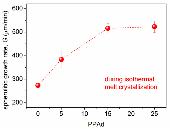 From the results of PLM (Figure 6) during melt-crystallization, we were able to estimate the spherulitic growth rate, G, which is presented in Figure 7. G increases in the copolymers from ~270 (neat PLA) up to ~520 μm/min (75/25) with the increase in PPAd. The effect could be correlated with the easier diffusion of the chains as manifested by the lowering of Tg.