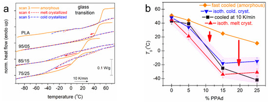 We may come now to the most interesting effect recorded herein. The basis for the discussion of this is Figure 8. Therein, we have plotted together the heating curves of Scans 3, 4 and 5 (Figure 8a). The results clearly show that the glass transition step is sharp and strong (high Δcp) in the case of the amorphous samples. Upon crystallization (both types), the glass transition becomes more broad and weaker, which is expected, nevertheless, it migrates toward lower temperatures. In terms of Tg, in Figure 8b, it is shown that whereas in the amorphous state the addition of PPAd leads to a maximum drop of Tg by ~40 K (75/25), the implementation of crystallinity additionally lowers the Tg by 8 K in PLA, ~15 K in 95/05 and ~50 K in 85/15 and 75/25. The effect seems controversial considering the expected effects of crystallinity, usually imposed on conventional polymers, hindering the mobility of the chains and elevating the Tg [16,49,50,51].