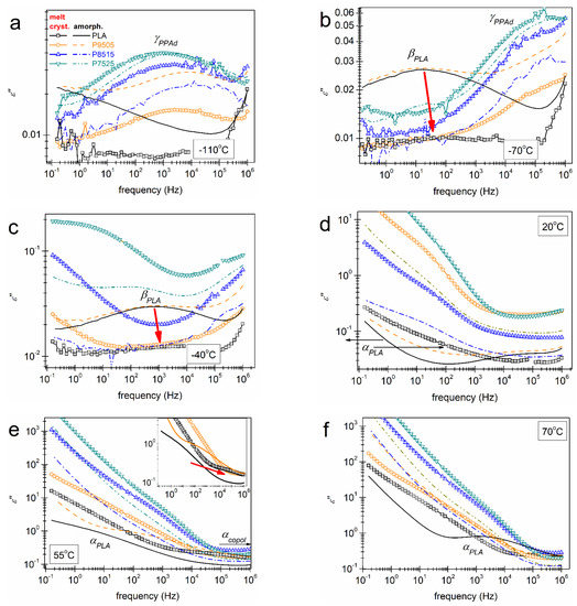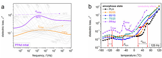 In Figure 9a, we can follow the local γPPAd located between 102 and 103 Hz at −110 °C and the segmental αPPAd located between ~102 and 103 Hz at −50 °C by the naked eye for PPAd. The relaxation peaks migrate toward higher frequencies upon increasing temperature (increasing the provided thermal energy) due to acceleration of the corresponding molecular groups. To facilitate a more direct comparison with calorimetry, the raw BDS data (isothermal curves, Figure 9a and Figure 10) can be presented upon replotting to the form of ‘isochronal’ ε″(T) curves. These are shown in Figure 9b for all samples in the initially amorphous state and at f ~ 125 Hz. Therein, PLA exhibits a local and a segmental relaxation, βPLA and αPLA, respectively.