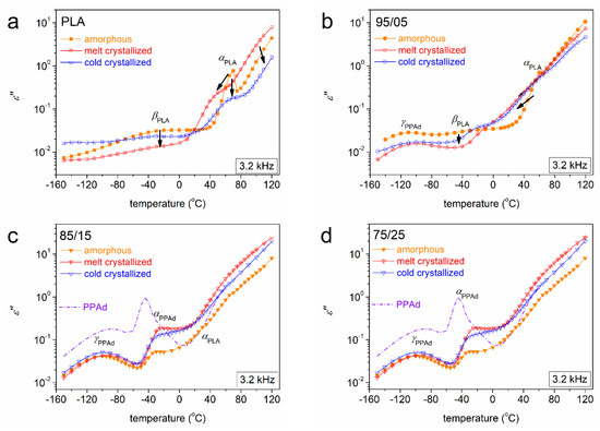 Comparative isochronal ε″(T) plots at f ~ 3.2 kHz for (a) PLA, (b) 95/05, (c) 85/15 and (d) 75/25, showing the effects on relaxation processes from the amorphous state (solid symbols) to the semicrystalline state (crossed and open symbols). For comparison, we added in the ε″(T) plot at f ~ 3.2 kHz for initial PPAd in (c,d). The added arrows mark the crystallinity-imposed effects.