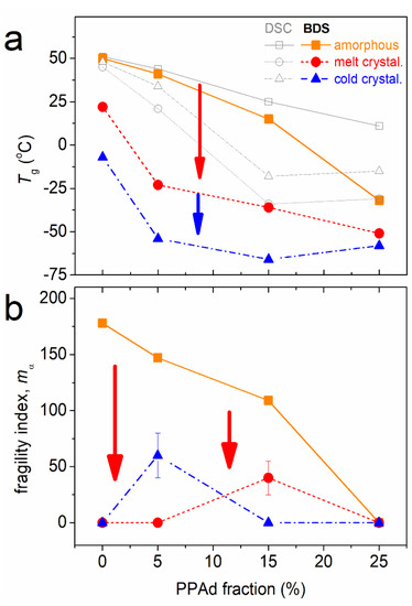 In Figure 14, we concentrate the overall dynamics data in terms of Tg,diel (Figure 14a) and fragility (cooperativity, Figure 14b). The impact of PPAd addition is systematically the acceleration in dynamics and suppression in fragility (mainly the vanishing of cooperativity). These effects are strongly enhanced, i.e., in the same direction, when crystallization is implemented.