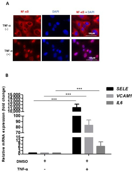 Establishment of inflammatory phenotype in HUVECs. (A) Immunofluorescence images showing control (−) and TNF-α treated (+) HUVECs which were stained with anti-NF-κB antibody (red) and nuclei were counter-stained with DAPI (blue). (B) Bar graph showing relative mRNA levels of SELE, VCAM-I, and IL6 after normalization to housekeeping gene GAPDH, in DMSO control and TNF-α treated cells. One-way ANOVA with Tukey’s post-test was used; values are mean ± SD of three biological replicates (*** = p < 0.0001).