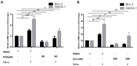 BRD4 inhibitor efficacy. (A) Bar graph showing relative mRNA levels of BCL2 and HMOX-1 after normalization to house-keeping gene GAPDH, in DMSO control, TNF-α-only, RVX208, and RVX208, followed by TNF-α treatment (left panel). (B) DMSO control, TNF-α-only, JQ1, and JQ followed by TNF-α treatment (right panel). One-way ANOVA with Tukey’s post-test used. Values are mean ± SD of three biological replicates (** = p < 0.01, * = p < 0.05 and ns = non significant).