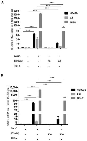 To our knowledge, this is the first RVX208 study on HUVECs. Therefore, we first checked the appropriate concentration of the RVX208 for experimentation. For this purpose, we treated cells with different concentrations of RVX208: 50-, 100-, 150-, and 200 μM for 4 h. Then, we treated cells with TNF-α for 2 h. Cells were harvested and analyzed for proinflammatory marker SELE. No significant reduction in the SELE expression was observed after 4 h RVX208 pretreatment at any concentration (Supplementary Figure S1A). Next, we pretreated the cells with 60 μM of RVX208 for 12-, 24-, and 48 h, followed by TNF-α treatment for 12 h. We observed significantly reduced expression of SELE after RVX208 pretreatment in all three-time points. Using the same above-mentioned approach, we tested 500 nM and 1 μM concentrations for HUVEC (data not shown) as previously used by Brown et al., 2014 and Wang et al., 2016 [6,26]. We found that 500 nM of JQ1 for 12 h was a sufficient inhibitory dose. Based on this, we selected treatment with 60 µM RVX208 and 500 nm JQ1 for 12 h (as a safe and effective BRD4 inhibitory dose) before stimulation with TNF-α for further experiments.