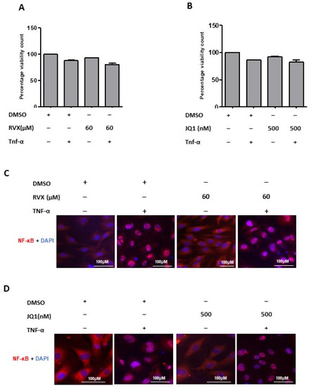 BRD4 inhibitors efficacy. (A) Cell viability assay; the bar graph shows percentage cell viability count in treatments with JQ1 after 12 h treatments. (B) bar graph shows percentage cell viability count in treatments with RVX208 after 12 h treatments. Inhibition of BRD4 function and target genes expression (C,D) Immunofluorescence images for the effect of RVX208 and JQ1 on the cellular localization of NF-κB in response to indicated treatments. HUVECs are stained with anti-NF-κB antibody (red) and DAPI (blue). Two-way ANOVA with Bonferroni’s post-test used. Values are mean ± SD of three biological.