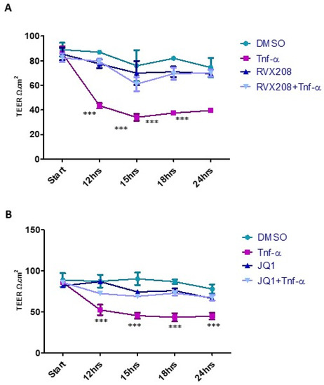 BRD4 inhibition protects monolayer integrity in HUVECs. (A,B) HUVECs grown on a 0.45 μM transwell membrane for 5 days to establish intact monolayers. HUVECs are treated with DMSO, TNF-α-only, JRVX208/JQ1-only, and JQ1/RVX208, followed by TNF-α. Line graph shows TEER measured in HUVECs monolayer, treated with DMSO and TNF-α for 12 h. Two-way ANOVA with Bonferroni’s post-test used. Values are mean ± SD of three biological replicates (*** = p < 0.001).