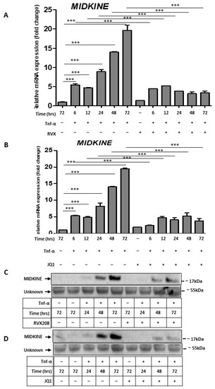 Next, we used JQ1 and RVX208 pretreatments for 12 h to inhibit BRD4 in HUVEC monolayers followed by TNF-α from 6 h to 72 h. BRD4 inhibition significantly reduced the midkine expression at mRNA (Figure 7A,B) and protein levels (Figure 7C,D). These results indicated that midkine could be another target of BRD4 during inflammatory response in HUVECs and that inhibition of BRD4 results in decreased expression of midkine.