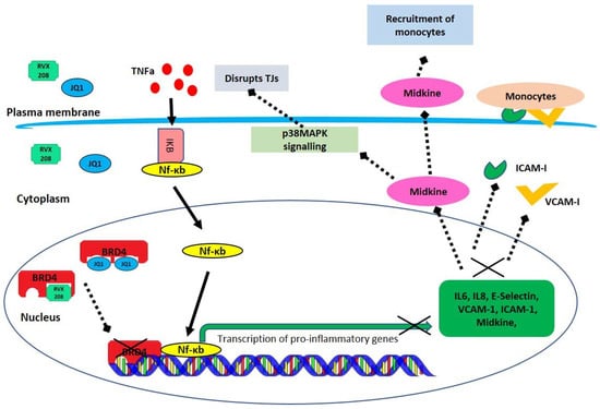 BRD4 inhibition reduces the expression of proinflammatory markers in ECs. Inflammatory stimuli (TNF-α) induces activation and translocation of NF-κB into nucleus. NF-κB, along with BRD4 protein, transcribe proinflammatory markers, including (1) I-CAM, and VCAM-I, which express on ECs monolayer and bind to monocytes from blood and (2) midkine, which contributes to recruitment of monocytes, activates p38MAPK-mediated disruption of tight junctions in ECs, and increases the permeability of ECs monolayer. Small molecular inhibitors of BRD4 bind to BRD4 bromodomains and inhibit its binding to chromatin, which reduces the expression of proinflammatory markers and midkine and protects ECs from dysfunction and tight junction disruption.