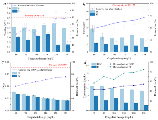 The effect of coagulant dosage on the removal of turbidity (a), chromaticity (b), UV254 (c), and DOC and PI (d) in the effluent of sedimentation and filtration units.