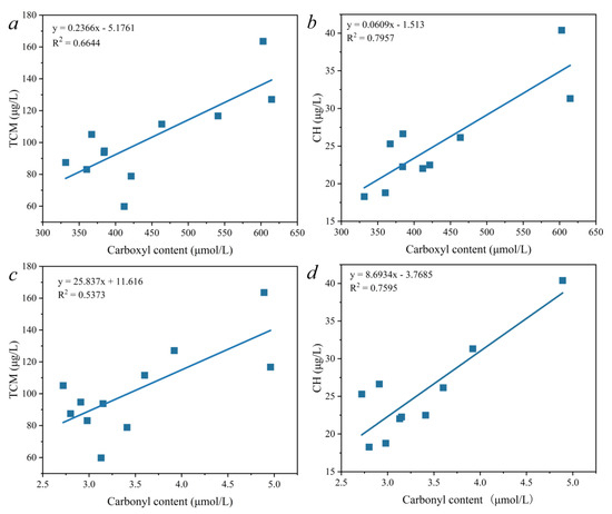 The fitting results of the carboxyl groups and the THM and CH production amount are shown in Figure 5a,b. It can be seen from the results shown in the figure that the linear fitting R2 values of the carboxyl groups and the TCM and CH were 0.6644 and 0.7957, respectively. The carboxyl groups had the strongest correlation with CH, followed by TCM. Figure 5c,d show the linear correlation analysis between TCM and carbonyl content and between CH and carbonyl content, respectively. The linear fitting R2 values of carbonyl and TCM and carbonyl and CH were 0.5373 and 0.7595, respectively. The linear correlation between carbonyl and CH was the strongest, followed by that of carbonyl and TCM.