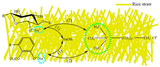 Then, the oven-dried rice straw in the beaker was modified with 50 mL quaternary ammonium cationic surfactant solution, and the beaker was placed in in a water bath at a 20 °C for 60 min. Samples were then dried in an oven at 65 °C for 24 h for the use for adsorption.