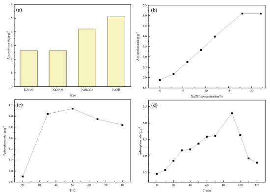 Effect of alkali modification conditions: alkali type (a), NaOH concentration (b), treatment temperature (c) and treatment time (d).