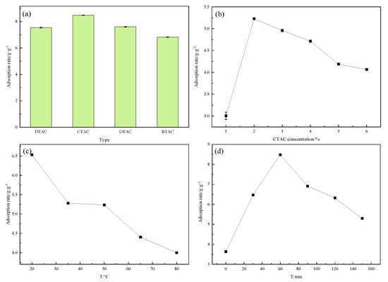 Effect of cationic surfactant modification conditions: cationic surfactant type (a), CTAC concentration (b), surface modification temperature (c) and surface modification time (d).