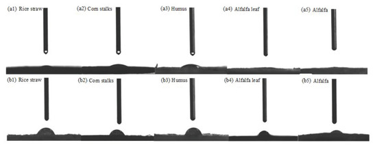 In order to determine the change in the contact angle between the materials with deionized water before and after treatment, the materials were analyzed by a contact angle measurement instrument. Figure 4 and Table 3 show the contact angle between materials and deionized water, with Figure 4a,b representing the contact angle between unmodified and modified materials, respectively, with deionized water. Figure 4b shows that the contact angle between various materials and deionized water significantly increases from 0° to about 70° owing to CTAC modification, demonstrating that the modified materials exhibit hydrophobic characteristic [23], with rice straw exhibiting increased hydrophobicity. The modified rice straw displays the highest oil adsorption ability, which can be attributed to its hydrophobicity and the porosity of its surface [24].