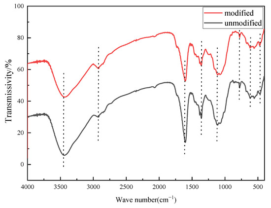 The rice straw was characterized using an FTIR spectrometer before and after modification. Figure 5 shows that there is no significant difference between the unmodified and modified peaks. However, the intensity of the C-H band at 2800–2900 cm−1 [7,20,23] increased, whereas other peaks weakened, owing to the substitution reaction of NaOH and the CTAC compound modification treatment.