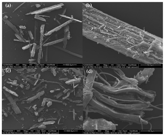 Finally, in order to observe the morphology and microstructure of rice straw before and after modification, the material was analyzed by SEM. Figure 8 shows the tubular structures of unmodified (a),(b) and modified (c),(d) rice straw. Figure 8c shows that modified rice straw is easier to separate into a single tubular structure, and Figure 8d shows the porous and loose web structure of the fibers. A comparison of Figure 8 shows that the surface area of the rice straw increased, enhancing its hydrophobic properties [29] and supporting the contact angle measurements and N2 adsorption–desorption data reported earlier in this article.