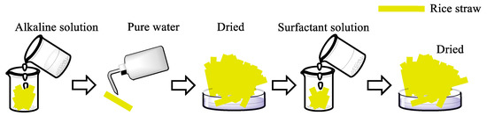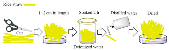 The rice straw was cut into pieces 1–2 cm in length and soaked in deionized water for 2 h; then, the samples were cleaned once with distilled water and placed in an oven at 65 °C to achieve constant weight [7]. A schematic representation of the pretreatment process is shown in Figure 9.