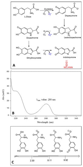 The presence of the catechol moiety in the chemical structure characterizes LD as a chromophore with a λmax value of 280 nm and allows us to obtain UV detection results sufficiently sensitive for LD determination in vegetable matrices [10]. Since the absorption spectrum of LD is highly characteristic (Figure 1B), its determination by spectrum acquisition (LC-UV analysis) is also selective. Although several scientific works reported the separation and quantification of LD in Vicia faba L. by using liquid chromatography coupled to a UV–Vis detector (LC/UV–Vis) [8,10,11,12,13,14,15,16,17,18,19,20,21,22,23,24,25], there are still some limitations regarding LD extraction/stability, chromatographic conditions, and method validation.