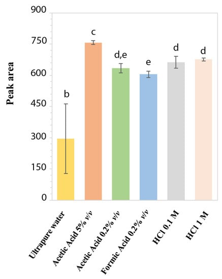 Stability histogram obtained by monitoring peak areas of LD standard solutions at 50 mg/L in different acidic media. Each bar represents the means ± standard deviation of the results obtained weekly for 3 consecutive months. Values marked by the same letter are not significantly different (p < 0.05).