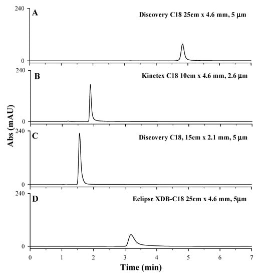 HPLC-UV chromatographic profiles obtained during the optimization of stationary phase: (A) Discovery C18 column, 250 × 4.6 mm, 5 µm; (B) Kinetex C18 column, 100 × 4.6 mm, 2.6 µm particle size; (C) Discovery C18 column, 150 × 2.1 mm, 5 µm; (D) Agilent ZORBAX Eclipse XDB C18 column, 250 × 4.6 mm, 5 µm. An LD standard solution at 50 mg/L solubilized in HCl 0.1 M, 97% acetic acid 0.2% v/v, and 3% methanol as mobile phase, under isocratic conditions depending on the tested C18 column (1 mL/min for Discovery C18 column, 0.8 mL/min for Kinetex C18 column and Agilent ZORBAX Eclipse XDB, 0.5 mL/min for Discovery Supelco C18 column.), injection volume of 20 µL and λmax set of 280 nm, were used.