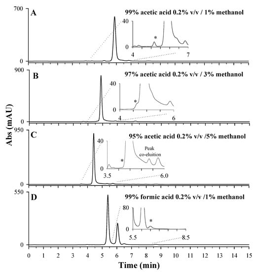 After choosing the most suitable stationary phase for LD separation, the mobile phase’s optimization tests were carried out on the sample extracts of Vicia faba L. broad beans to evaluate potential interferences. Four different mobile phases were tested, as reported in Figure 4: 99% of acetic acid 0.2% v/v containing 1% of methanol (Figure 4A); 97% of acetic acid 0.2% v/v containing 3% of methanol (Figure 4B); 95% of acetic acid 0.2% v/v containing 5% of methanol (Figure 4C); 99% of formic acid 0.2% v/v containing 1% of methanol (Figure 4D). A percentage of methanolic organic phase not higher than 5% was used to limit the collapse of the stationary phase. By comparing plots A, B, and C, it is possible to observe a clear improvement in terms of resolution of the LD chromatographic peak, due to an increase in percentage of the aqueous phase, containing 0.2% acetic acid, from 95% (Figure 4C) to 99% (Figure 4A). A similar trend was observed for 0.2% v/v formic acid as the aqueous phase. Having set the aqueous-phase percentage of 99%, the performances of the two acids, formic and acetic, were compared (Figure 4A,D). In both cases, a well resolved peak was observed for LD (see insets) even if a chromatographic separation of the most abundant interference compounds is achieved only using formic acid (Figure 4D). Furthermore, the employment of formic acid ensured a longer retention time for LD (6.5 min) compared to acetic acid (5.2 min). Formic acid is known to be an ion-pairing reagent, whereas acetic acid is not. The authors of [36] state that ionic interactions between the formate group (-COO−) and basic group (-NH3+) of LD occur and are responsible for the increase in retention time, improving the selectivity of chromatographic separation [37].