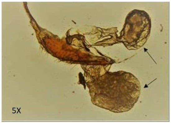 The defensive gland of the Mupli beetle, Luprops tristis. Arrows indicate the reservoir region of the gland.