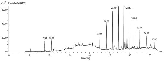 Gas chromatography high-resolution mass spectrometry (GC-HRMS) chromatogram of the defensive gland extracts of the beetle, L. tristis.