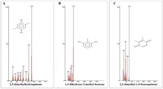 GC-HRMS analysis of identified quinone and phenolic compounds in the defensive gland extract of L. tristis. Data show the presence of 2,5-dimethylhydroquinone (A), 1,3-dihydroxy-2-methylbenzene (B) and 2,3-dimethyl-1,4-benzoquinone (C).