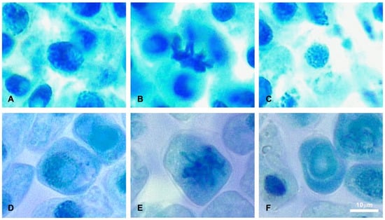 The effect of the defensive gland extract on dividing A. cepa cells. (A) Normal prophase, (B) normal metaphase, (C) normal nuclei, (D) disintegrated prophase, (E) abnormal metaphase and (F) disintegrated nuclei.