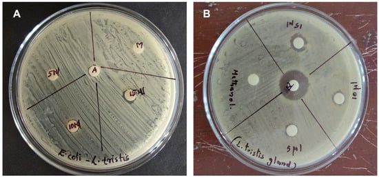 In vitro antibacterial activity of the gland extract of the Mupli beetle was studied by the agar disc diffusion assay method. To test the antibacterial activity, S. aureus and E. coli—two prominent Gram-positive and Gram-negative bacteria—were selected. These pathogens cause various diseases in human beings. The Mueller–Hinton agar (MHA) well diffusion method was employed to investigate the antibacterial activity. Spore suspension of bacteria was added to a sterile Mueller–Hinton medium before solidification. It was then poured into sterile Petri dishes (9 cm in diameter) and spread using a cotton swab. Various concentrations (5 µL, 10 µL and 15 µL) of the defensive gland extract were pipetted into sterile discs of 6 mm and placed at the centre of the Petri dish. The antibiotic kanamycin was used as a positive control in the experiment. The Petri dish was incubated for 16 h at 37 °C. The zone of inhibition was analysed to estimate the antibacterial effect [32].
