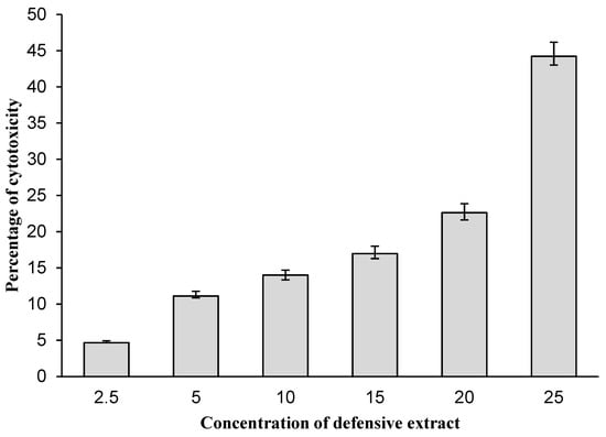 The anticancer property of the defensive gland extract of the L. tristis beetle was estimated, and the result of the analysis is presented in Figure 6. A cytotoxicity assay using Dalton’s lymphoma ascites (DLA) cells revealed the anticancer property of the defensive secretion of L. tristis. A gradual increase in cytotoxicity was observed with an increase in the concentration (10 µL–200 µL) of the extract.