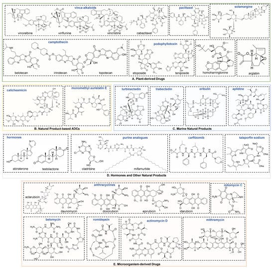 Chemical structures for plant-derived (A), ADCs (B), marine (C), hormones and other natural products (D) and microorganism-derived natural products (E).