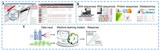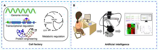 With the rapid development of artificial intelligence, robotics and integrated software are also widely used to automate standard workflows, in which researchers write programs and robots complete the experiments according to the programs (Figure 6B). This workflow significantly improves the efficiency of synthetic biology and subsequently improves the speed of researchers to explore and create active compounds. Synthetic biology is a type of “on-demand manufacturing” composed of a variety of nonlinear workflows. However, the heterogeneity and dynamics of biological experiments make the workflows more complex due to the differences among batches []. In recent years, biological foundries have been developed with the integration of the automatic design–build–test engineering cycle, which solves several difficult problems in the processes of bioengineering, such as slow speed, high expense and low repeatability []. Mohammad H. et al. reported an application of an integrated robot system combined with a machine learning algorithm; this application completes the design, construction, testing and learning process of a fully automated biological system []. The fully automated robotic platform IOAutomata evaluated slightly less than 1% of the possible variation, which was 77% higher than that achieved by random screening. The authors also successfully used the robotic platform to optimize the biosynthesis of lycopene.