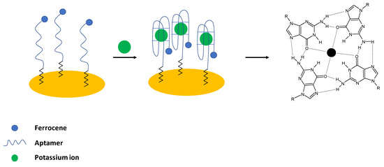 Historically, the first aptasensor elaborated for potassium ions detection was prepared by Radi and O’Sullivan [24]. In their work, an electrochemical aptasensor was developed, where Guanine—rich aptamers were applied as receptors in the sensing layer. In the presence of potassium ions, a random coil structure was changed into a compact G-quadruplex structure. As a result, a ferrocene label attached to the 5′ end of the sequence was moved to close proximity of the electrode surface, which led to the enhancement of the ferrocene anodic current (Figure 1). For the potassium ions concentration below 1 mM, a 1:1 complex with an aptamer was formed; whereas, for higher concentrations, a 2:1 complex was present. The proposed biosensor exhibited a linear response range from 0.1 to 1 mM with a lower limit of detection of 0.015 mM. The aptasensor showed high selectivity over interfering ions such as sodium, calcium, and magnesium, and the sensing layer was regenerated using 0.1 M HCl. The formation of a dense, compact layer in the presence of potassium ions was also evidenced using the impedance technique with the application of a ferri/ferrocyanide redox indicator.