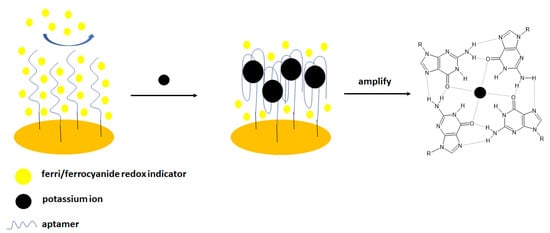 There are also examples where the gold electrode was additionally modified with different polymers or nanomaterials in order to obtain, e.g., lower detection limits. A good example of such is a biosensor, where the sensing layer was elaborated by the formation of the layer composed of p-aminothiophenol on the gold electrode surface. This was proceeded by the deposition of gold nanoparticles, which enhanced signal intensity and was an anchor point for the aptamer strand—5′-TTTGGTTGGTGTGGTTGGTTT- 3′-(CH2)6-SH. As a result, the small intensity of electrochemical response derived from the current of ferri/ferrocyanide redox indicator that was repulsed from the electrode surface. Further electrode incubation with potassium ions led to the formation of a G-quadruplex that was distinguished with an even higher charge density that caused a more pronounced repulsion of ferri/ferrocyanide redox couple and a smaller current response. The peak current decrease was linear with the logarithm of potassium ions concentration in the range of 10 pM–0.1 µM and 0.5 mM to 1 mM with a LOD of 0.13 pM. No significant signal change was observed after electrode incubation with 10 μM Ca2+, Mg2+, Na+, Li+, NH4+, Rb+, Cs+, Sr2+ and Ba2+[48].