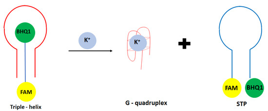 Another approach in the development of optical potassium aptasensor was shown by Verdian-Doghaei and co-workers [52]. This time, potassium ions were detected using a 30-nucleotide strand known as insulin binding aptamer (IBA). Such a sequence could form an intramolecular parallel G-quadruplex structure. In this approach, a triple—helix structure was formed with a central IBA sequence flanked by dual-labeled oligonucleotide conjugated with FAM fluorophore and BHQ1 quencher molecules (STM) (Figure 4). When the IBA sequence was not present, FAM and BHQ1 were in close proximity to each other. After the introduction of IBA, it bound to the loop sequence of STM thanks to the Watson Crick and Hoogsteen base pairing, which increased the FAM signal’s intensity. After adding potassium ions, IBA formed a G-quadruplex structure, and STM oligonucleotide was released. This caused the change of oligonucleotide conformation from linear to loop structure, and as a consequence, a smaller signal was obtained. A fluorescent signal was detected at 520 nm, and a linear response range was achieved from 0.05 to 1.4 mM with a LOD of 0.014 mM. A small response was obtained for interfering cations at 1 mM concentration, including Na+, Li+, NH4+, Ca2+, and Mg2+.