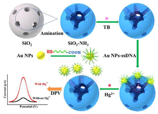 An interesting mechanism of mercury(II) sensing has been proposed by Ma et al. [60]. Aptasensor exploited the gold nanoparticles functionalized with a specific ssDNA aptamer (5′-COOH-CTT CTT CCC CCC CCT TCT TC-SH-3′). Nanoparticles act as a molecular gate, which may reversibly entrap redox indicator- toluidine blue (TB) inside the mesoporous silica nanocontainers (MSNs) structure. The TB detected by differential pulse voltammetry (DPV) was the source of the electrochemical signal. With the assistance of aptamer, modified AuNPs acted as gatekeepers of encapsulated TB molecules. In this state, a negligible electrochemical signal was recorded. The presence of Hg2+ caused the formation of a hairpin structure of aptamer on the surface of AuNPs, followed by the breakage of the bond between the aptamer and MSNs. Nanoparticles desorbed from the surface of NH2-MSNs, resulting in the Hg2+-dependent release of TB molecules (Figure 7). According to the authors, this method exhibited excellent analytical performance, e.g., a linear range from 10 pM to 100 μM with a detection limit at the level of 2.9 pM.