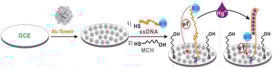 Electrochemical mercury aptasensor, characterized by a very simple working principle, was also developed with the use of “Au nanoflowers” [63]. Its mechanism was based on the structural rearrangement of ssDNA aptamer labeled with methylene blue (5′-SH-(CH2)6-TTCTTTCTTCGCGTTGTTTGTT-MB-3′) caused by interaction with Hg2+. DNA probe switched from loose to a rigid hairpin form of DNA duplex. This conformation caused a shortening of the distance between the MB and GCE electrode surface decorated with gold nanoflowers, which resulted in an increase in peak current recorded by means of square wave voltammetry (SWV) (Figure 9). The detection limit of such an aptasensor was 0.062 fM, and a linear range was observed in the concentration window from 1 fM to 1 nM.