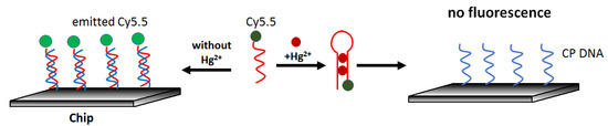 Real-time optical mercury(II) determination can be carried out using an aptasensor constructed on a waveguide platform, as presented by Chen et al. [65]. The sensor was based on the competition of the interaction of a fluorescently labeled aptamer (Cy5.5-ATCCCCTTTGTTTGTTTAGCCCCTATTCTTTCTTGGTCTGC) with mercury and a complementary sequence on the surface (GCAGACCAAGAAA). It owed its simple principle to the fact that the probe exhibited a higher affinity for mercury than cDNA. The lack of hybridization resulted in a decrease in the fluorescence intensity excited via the waveguide. (Figure 11). The authors determined the detection limit in the water sample at 0.2 μg/L, and the response linearity was observed from 1.4 μg/L to 240.7 μg/L Hg2+.