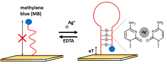 The next example of electrochemical detection of silver ions is a ssDNA oligonucleotide-based sensor proposed by Kim [74]. The presence of Ag+ influences the conformation of the DNA strand and thus changes the electron transfer efficiency. At the beginning, the aptamer was in the form of single-stranded DNA with the methylene blue (MB) labeled to one of the ends of the DNA sequence, located far from the electrode. In the presence of silver ions, the DNA changes its structure to z hairpin probe DNA. This is possible due to the high affinity of silver ions to cytosine and the formation of C-Ag-C structures. It caused methylene blue to be near the electrode surface, which allowed for easier electron exchange and, thus, the increase in voltammetric signal (Figure 15). This sensor had a LOD at the level of 10 nM with a linear range between 10 and 200 nM. The behavior of the aptasensor after the addition of other metal ions such as Mg2+, Ca2+, Ba2+, Fe3+, Co2+, Ni2+, Cu2+, Zn2+, Cd2+, and Pb2+ at 500 nM represented by lack of signal change confirmed good selectivity of the developed approach.