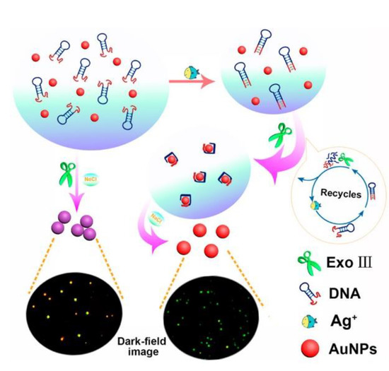Scheme of DNA based Ag+ sensing through Dark-Field Microscopy. Adapted with permission from Li et al. [80] (Copyright © (2018) ACS).