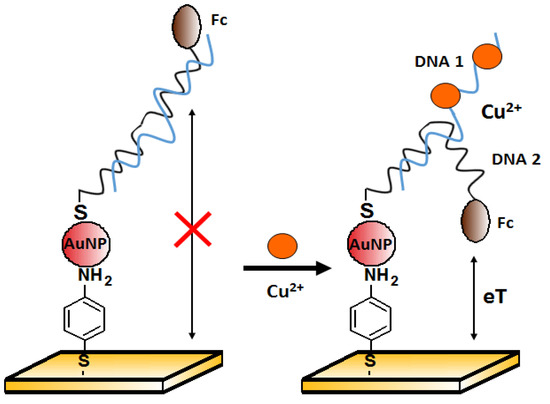 One of the approaches to copper(II) ions detection is the method proposed by Chen et al. [85]. The authors presented an electrochemical aptasensor for Cu2+ detection based on gold nanoparticles (AuNPs) assembly on the working electrode. Two DNA sequences were used. First: 5′-GAA TTC TAA TAC GAC TCA CTA TAG GAA GAG ATG GCG ACT GTT TAG AAG CAG GCT CTT TCT TAT GCG TCT GGG CCT CTT TTT AAG AAC-3′ was attached to the AuNPs surface. The second, Ferrocene (Fc)-labeled: 5′-Fc-(CH2)6-GAATATAGTGAGCTA CGC TAG AAT TC-(CH2)6-SH-3′ was the source of the electrochemical signal detected by the square wave voltammetry (SWV). Both sequences were partially complementary to each other. In the absence of Cu2+ (Figure 19, on the left), the double helix was rigid enough to prevent the redox label from getting close to the electrode, and the recorded current signal was small. After copper binding by the aptamer, the structure was partially unraveled, and the released strand could allow ferrocene to approach the electrode. Therefore, an increase in signal was observed in the presence of copper(II) over the range from 0.1 nM to 10 μM, with a detection limit of 0.1 pM. Good selectivity was confirmed against other divalent metal ions (1 μM Ca2+, Co2+, Mg2+, Ni2+, Pb2+, Sn2+, and Zn2+). These metals were not found to interfere with the detection of Cu2+.