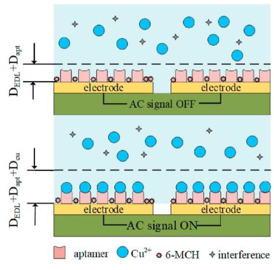 - Qi, H.; Huang, X.; Wu, J.; Zhang, J.; Wang, F.; Qu, H.; Zheng, L. A disposable aptasensor based on a gold-plated coplanar electrode array for on-site and real-time determination of Cu2+. Anal. Chim. Acta 2021, 1183, 338991. [Google Scholar] [CrossRef]