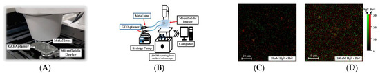 In another example of mercury detection, An et al. [59] used a liquid-ion gated field effect transistor (FET) in the developed Hg2+ aptasensor (Figure 6). In this case, the graphene was used at the transducer layer to facilitate the conjugation of aptamers via appropriate linkers: diaminonaphthalene (DAN) and glutaraldehyde (GA). DNA sequences capable of interacting with mercury ion (3′-amine-TTC TTT CTT CCC CTT GTT TGT-C10 carboxylic acid-5′) were covalently immobilized. Thanks to the label-free mechanism, it was possible to obtain a real-time response to variable mercury(II) concentrations as low as 10 pM.