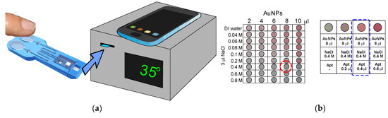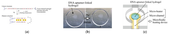 - Yoshida, K.; Hayashi, T.; Takinoue, M.; Onoe, H. Repeatable detection of Ag+ ions using a DNA aptamer-linked hydrogel biochemical sensor integrated with microfluidic heating system. Sci. Rep. 2022, 12, 9692. [Google Scholar] [CrossRef]