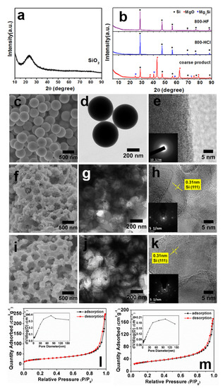 XRD patterns of the pristine SiO2, coarse product of the reduction, 800-HCl, and 800-HF (a,b). SEM (c,f,i), TEM (d,g,j), HRTEM (e,h,k) images and SAED patterns (insets of images (e,h,k)) of the pristine SiO2 (c–e), 800-HCl (f–h), and 800-HF (i–k). N2 adsorption and desorption isotherms and the corresponding BJH pore size distribution curves of 800-HCl (l) and 800-HF (m).
