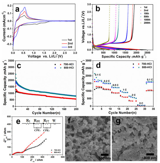 Figure 2e depicts the Nyquist plots of the 800-HCl and 700-HCl electrodes after 200 cycles. The electrochemical process is represented by the equivalent circuit model in the inset. The depressed semicircle in the high-frequency range stands for the charge transfer impedance (Rct) [27]. The Rct values of the 800-HCl and 700-HCl electrodes after 200 cycles were fit as 75.8 Ω and 82.7 Ω, respectively. Even though the BET surface area of 800-HCl was lower than 700-HCl, the Rct resistance of the 800-HCl electrode was still decreased, which indicated that the removal of residual silica made a higher contribution to the improvement in the electrochemical kinetics.