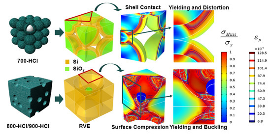 However, peak stress reaching the yield limit does not mean that all of the silicon within 800-HCl entered the plastic state and lost its ability to withstand the load. Thus, to identify the relationship between the structural morphology and potential structural failure, Figure 4 was also elaborated. The stress and plastic strain distribution were drawn under the same SOC. For the sake of comparison, the von Mises stress was normalized with the yield stress and the edges of the original structure were drawn with white lines. These results showed that the causes of stress and the underlying mechanical failure in these two structures were quite different. Due to the constraint of the central silica, the stress in the 700-HCl sample during lithiation mainly originated from the contact of adjacent shells. Attributed to the expansion of the silicon shell and the local effect of contact, the Si/SiO2 interface of this structure was twisted outwards from the extrusion zone, which could easily cause shear failure of the interface. Instead of this, the remaining silica material in the porous structure did not play the role of a mechanical restraint. Stress caused by silicon expansion was undertaken by its three-dimensional continuous structure. The deformation was directed into the hole during expansion, so the free surface of the porous structure was compressed and buckled due to the compression instability. Since the deformation was large, plastic deformation also surrounded these buckling areas. As the interface failure was irreversible, the cyclic performance for the 700-HCl sample was relatively worse in withstanding the alternate lithiation deformation. Therefore, from a mechanical point of view, although the 800-HCl/900-HCl sample yielded earlier during lithiation, it was more likely to maintain its mechanical integrity, resulting in a better electrochemical performance, which was also confirmed by the electrochemical cycle tests shown in Figure S3.