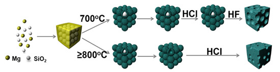 Based on the results addressed so far, the structure and morphology of the as-synthesized silicon was significantly modified when the magnesiothermic reduction temperature was increased from 700 °C to 800 °C [17]. A 3D macroporous network was formed directly after the magnesiothermic reduction at 800 °C. The detailed structure formation process of the porous silicon at 800 °C is illustrated in Scheme 1. The Mg melted and the vapor reacted with silica from the outer surface to the inner core of the silica particles. The higher vapor pressure significantly promoted the reaction between the silica and magnesium. The in situ-generated silicon diffused together to construct a 3D continuous silicon network templated by the silica colloidal crystals. At 700 °C, the conversion from silica to silicon was limited because the temperature was only slightly higher than the melting point of magnesium (648 °C). A decent amount of silica still remained that kept the original spherical shape. The in situ-formed silicon on the surface of adjacent sphere particles diffused together and formed a continuous network as shown in the schematic structure in Scheme 1. By removing the unreacted silica after the HF etching process, the 3D continuous porous silicon structure was uncovered. When the temperature was increased to 800 °C, the reduction of the silica was significantly enhanced because the magnesium vapor had a higher vapor pressure. Not only the surface, but also the interior regions of the silica nanoparticles were converted to silicon, leading to an almost total consumption of the silica particles. As a result, a 3D macroporous silicon network is generated directly after reduction as exhibited in the 800-HCl sample. Because there was only a limited amount of residual silica within the HCl-washed sample, the 3D continuous silicon network structure did not change significantly after HF etching. Only the specific surface area and porosity changed slightly due to the removal of the small amount of silica.