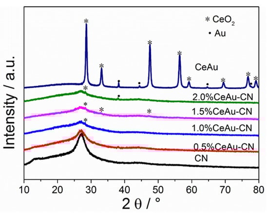 The XRD patterns of CN, x% CeAu–CN (x = 0.5, 1.0, 1.5, 2.0), and CeAu.